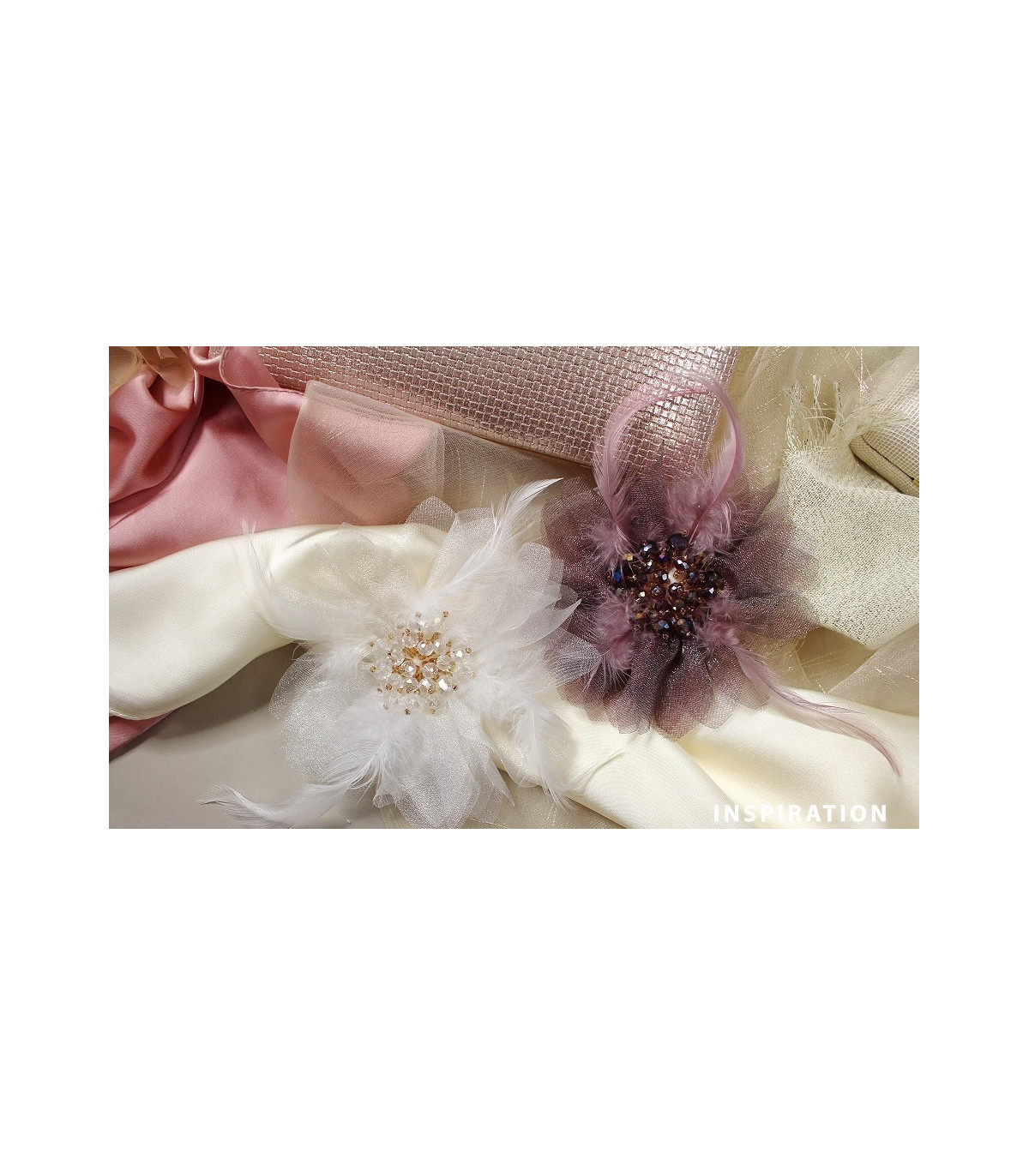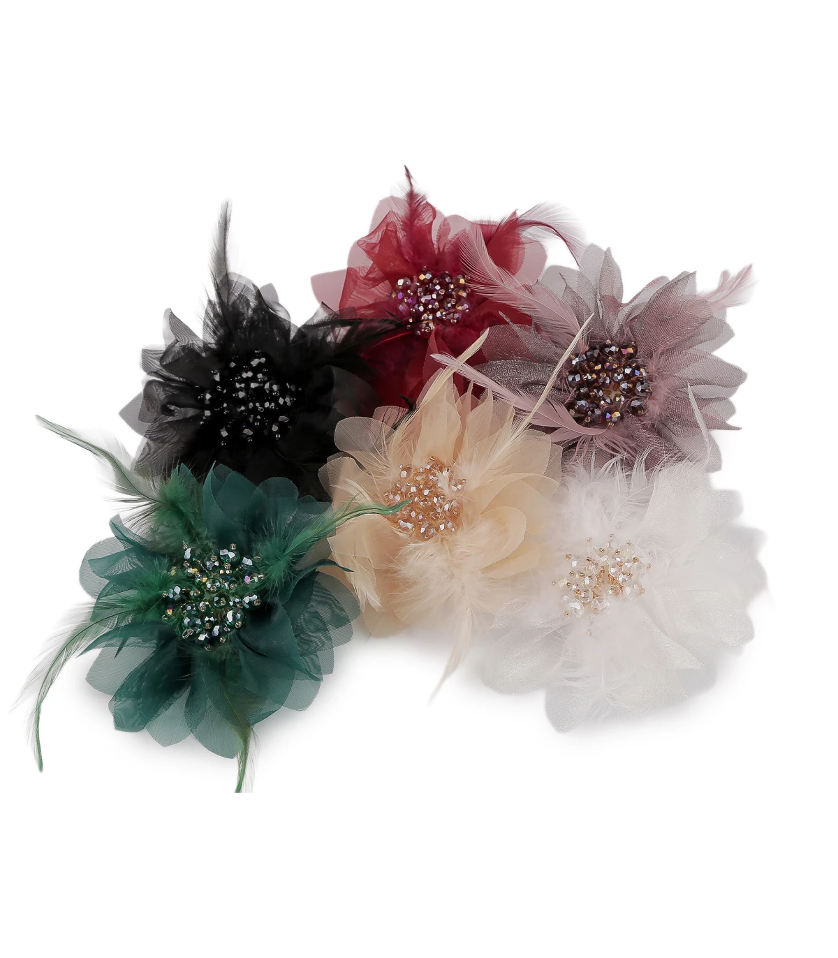 Diese große und elegante Brosche besteht aus zartem Chiffon in Blumenform. Das Zentrum ist mit Federn und funkelnden Kristallperlen verziert, was ihr eine luxuriöse Ausstrahlung verleiht.
