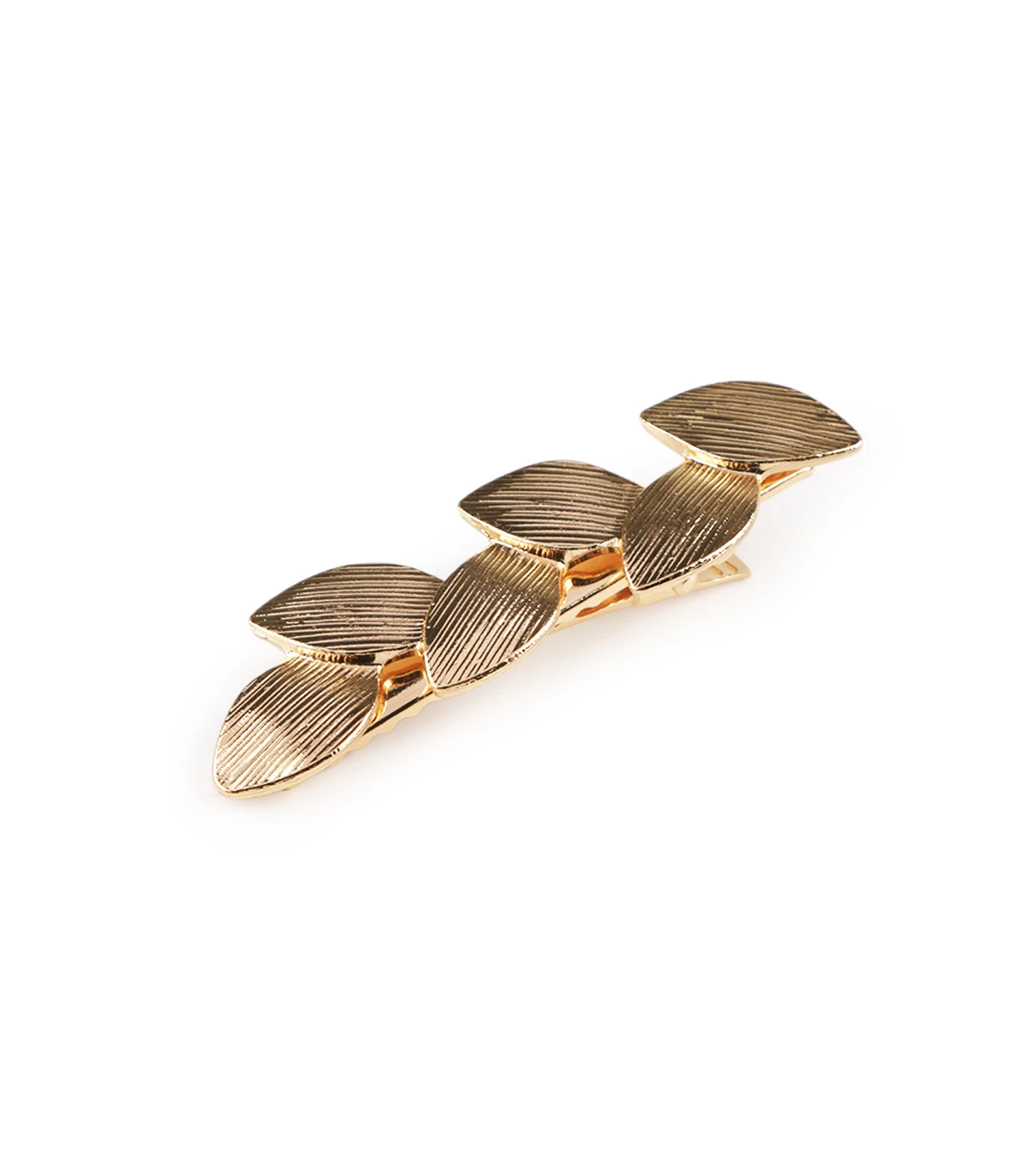 Dieser blattförmige Haarclip ist ein elegantes Accessoire, das Ihrer Frisur Stil und Charme verleiht. Er besteht aus hochwertigem Metall mit feiner gerillter Struktur und hält dank seiner Zähne sicher im Haar.