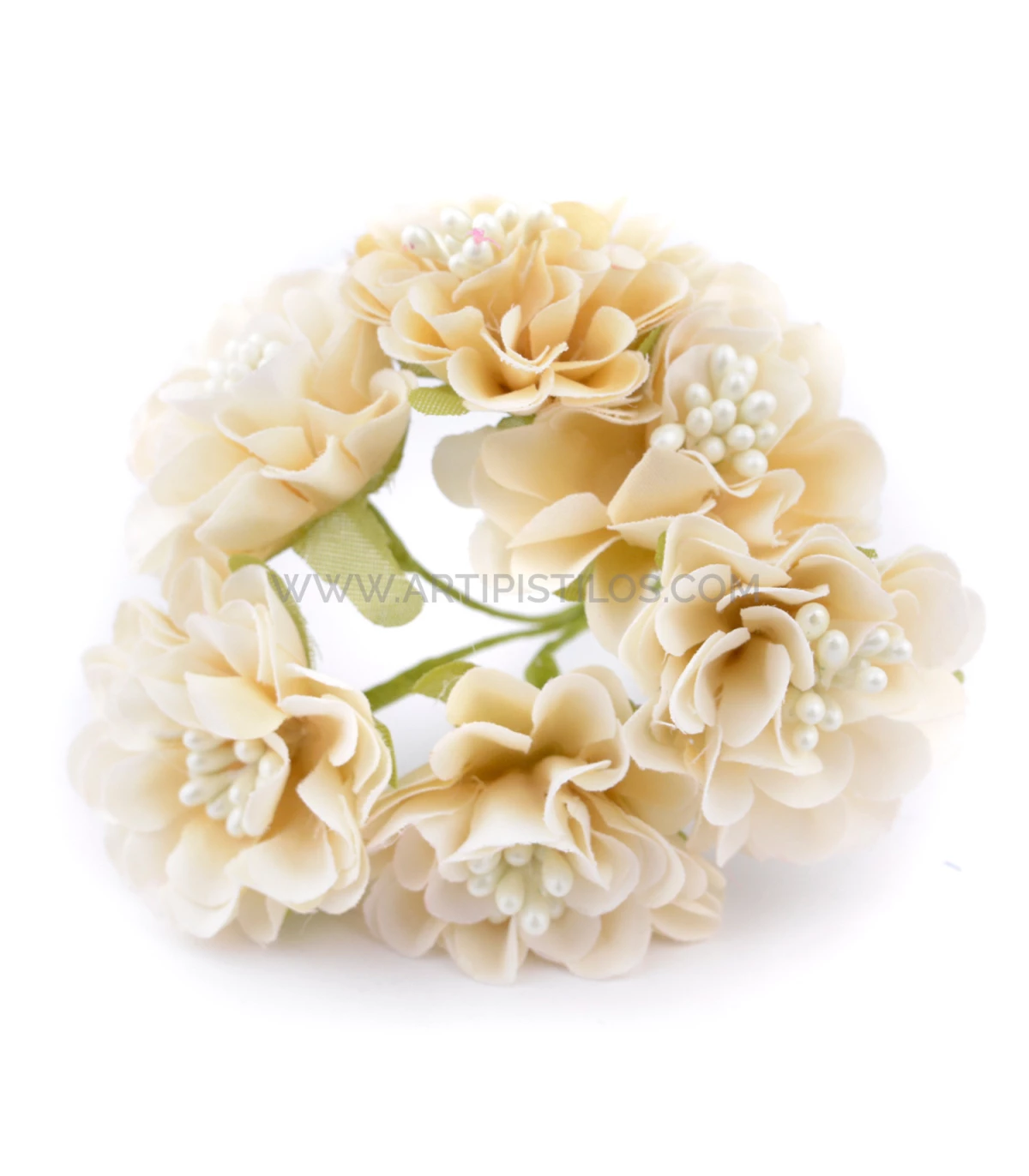 Bouquet composed of 6 units of fabric flowers. Flowers include pearly pistils.