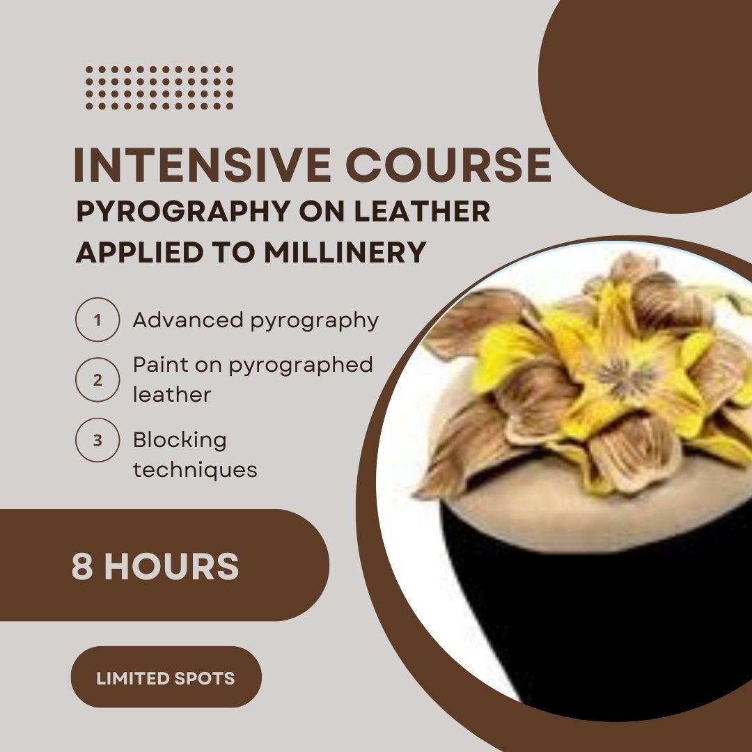 Discover the art of pyrography applied to millinery in this course, where you will learn to work with leather and skin, combining the pyrography technique with painting to create unique pieces.