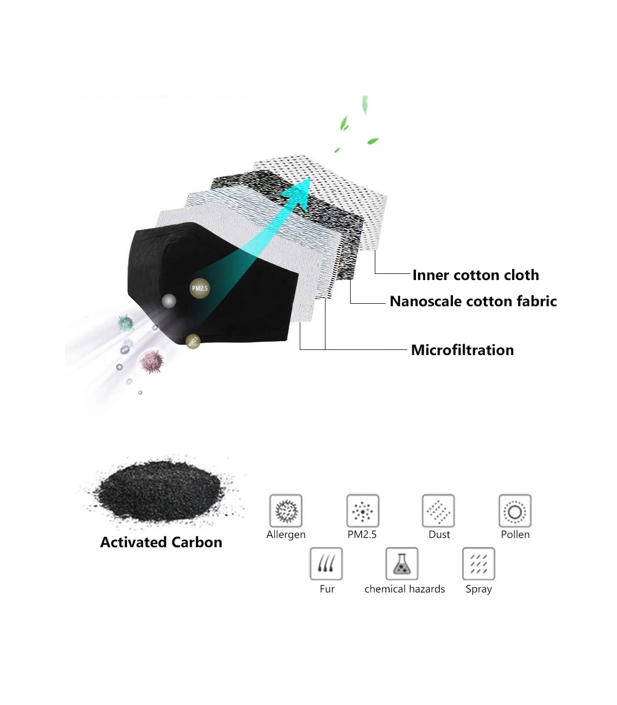 These activated carbon filters have 5 layers of filtration as you can see in the image below and offer the same protection as a surgical mask, an FFP2 KN95 mask.