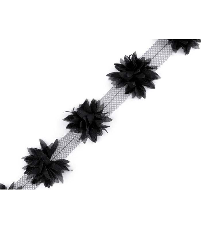 This strip of tulle is decorated with folded flowers of the same color as the base tulle and are spaced between 6 and 9 cm (measured from center to center of flower). They are usually used for dresses (waist, neckline, hem...)