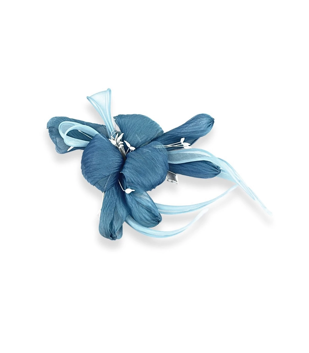 This delicate flower is crafted from high-quality organza, with soft and elegant petals that create a sophisticated and lightweight piece. The stamens, handmade with carefully crafted thread, add a unique artisanal touch to the flower, providing rich, detailed texture that enhances its beauty. It is perfect for exclusive millinery projects, fascinators, weddings, and high-end decorations.