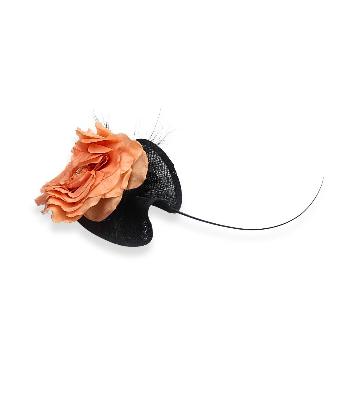 This elegant headpiece features an impressive large organza flower, with pistils in its center, adding a unique touch of delicacy and sophistication. The base is made from sinamay, providing a light and elegant structure.
