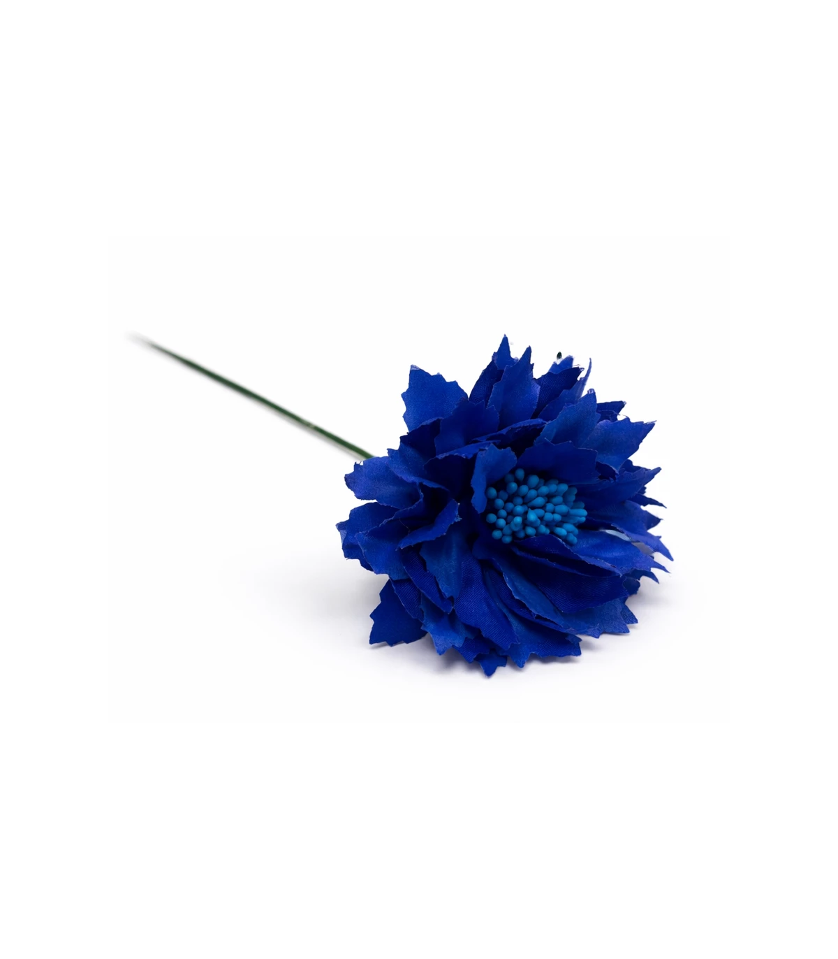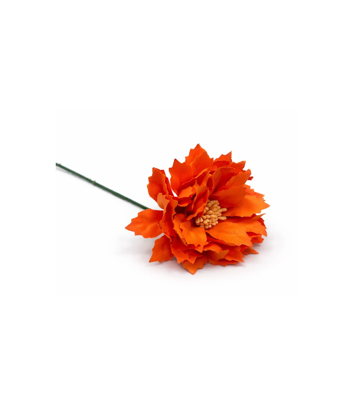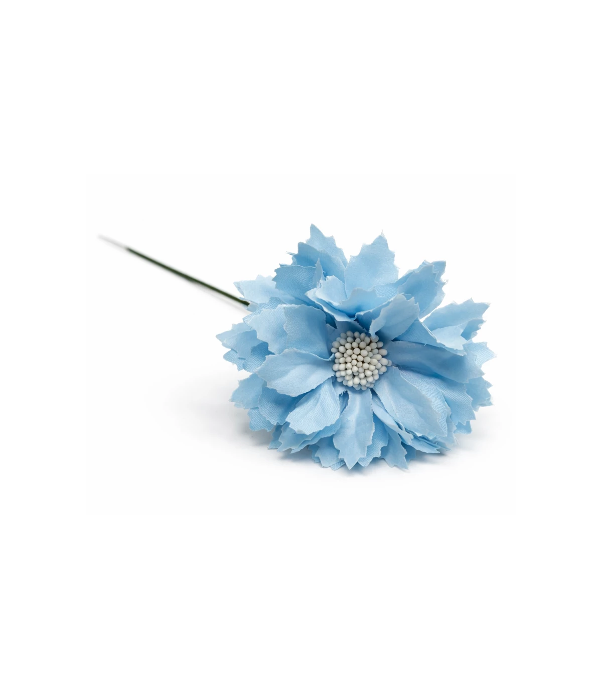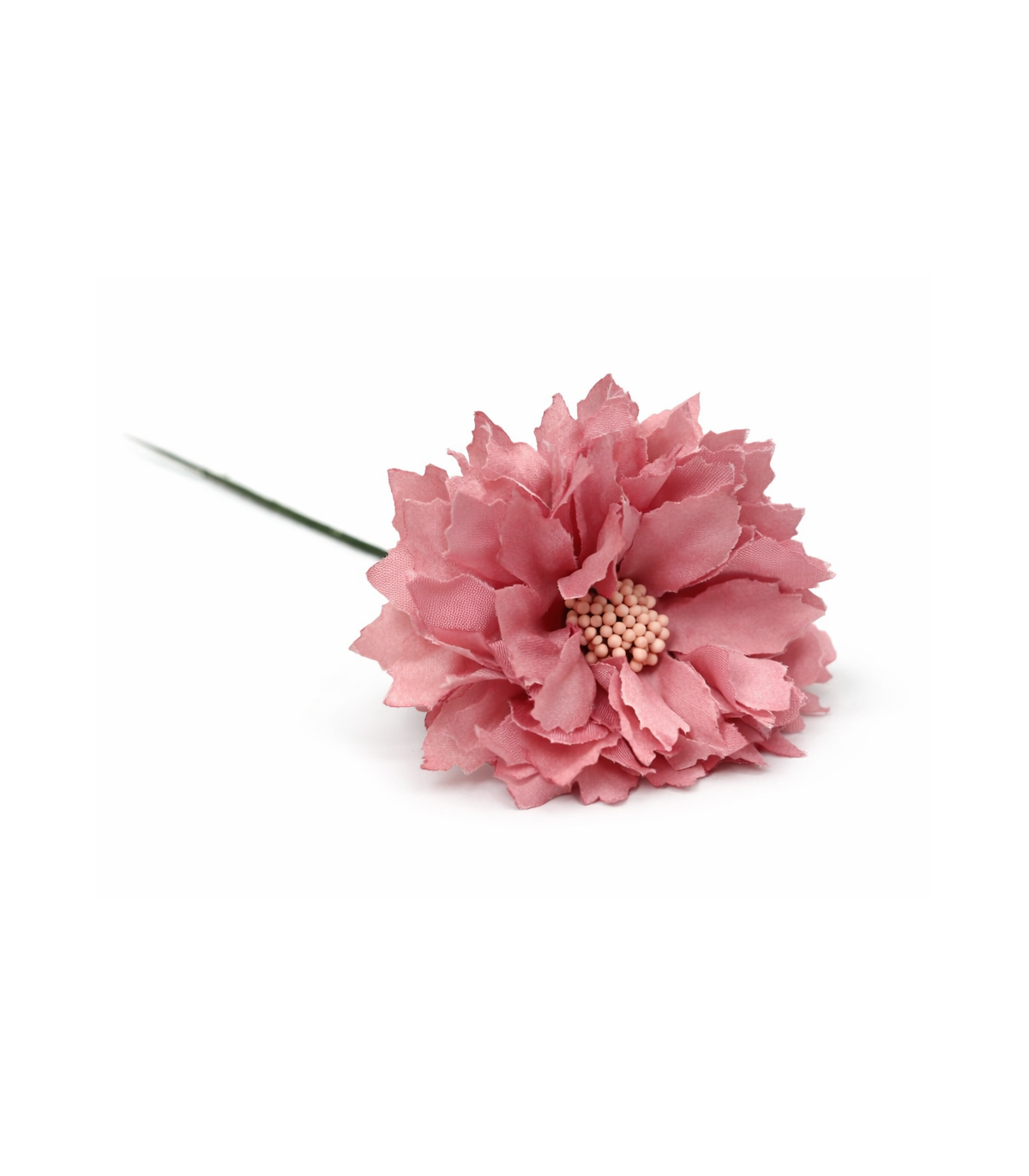 Decorative mini dahlia made from synthetic fabric, featuring inner stamens that add volume and a realistic finish. Its balanced and lightweight design makes it ideal for millinery and creative decoration.