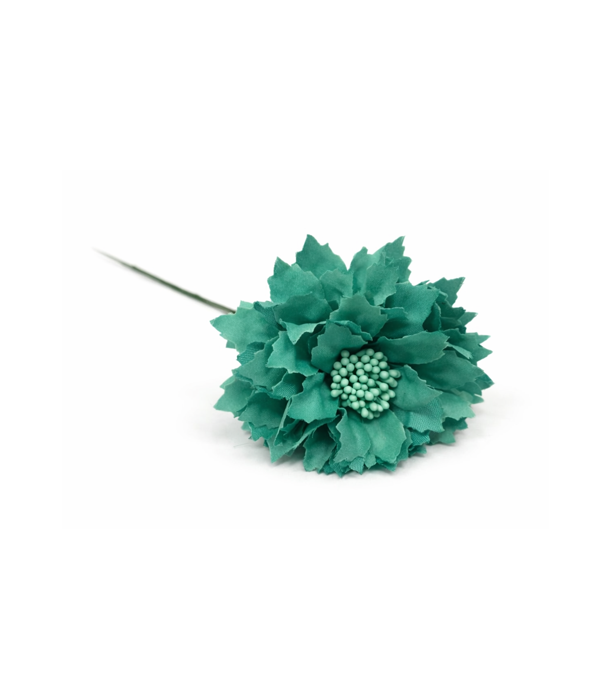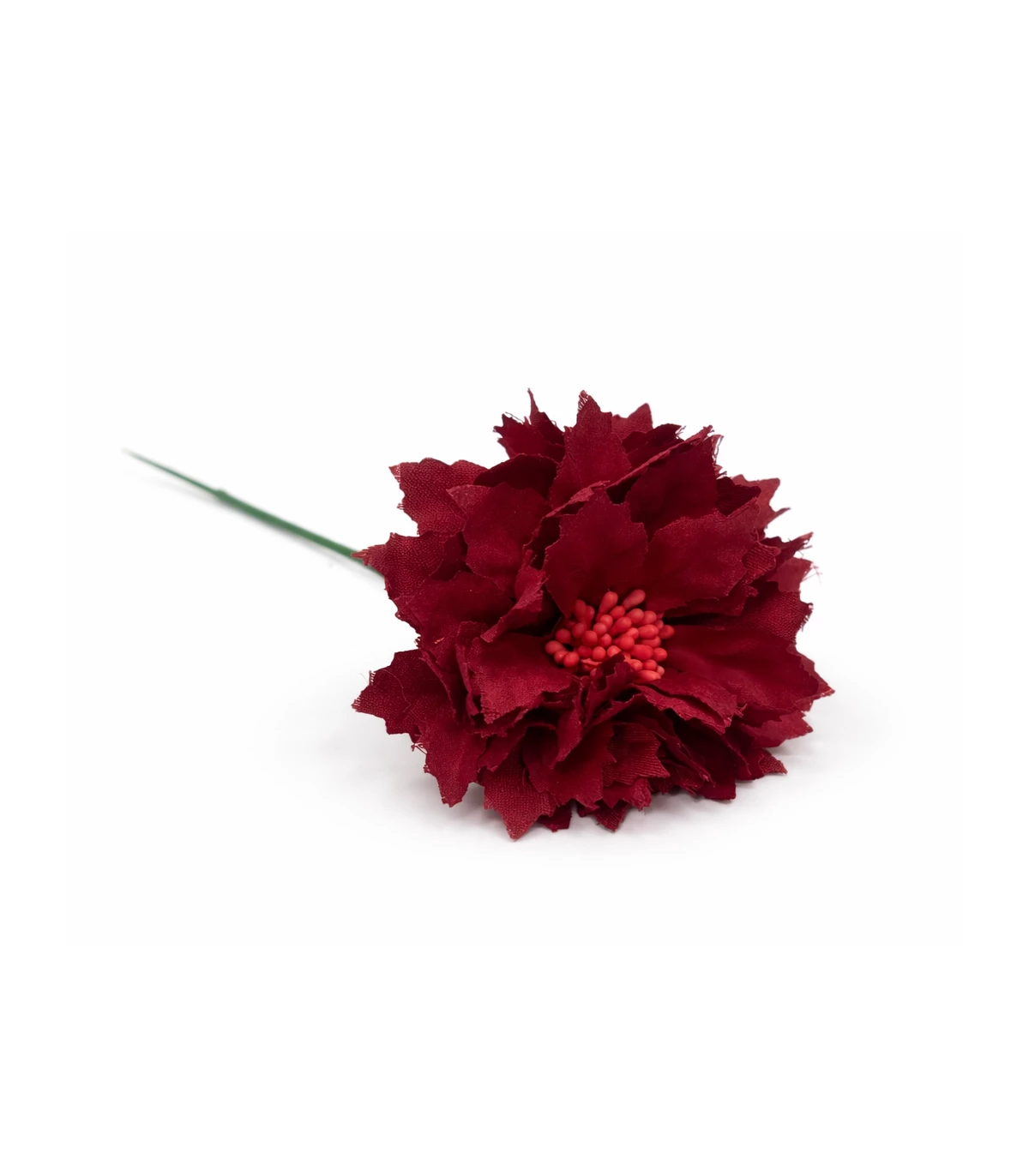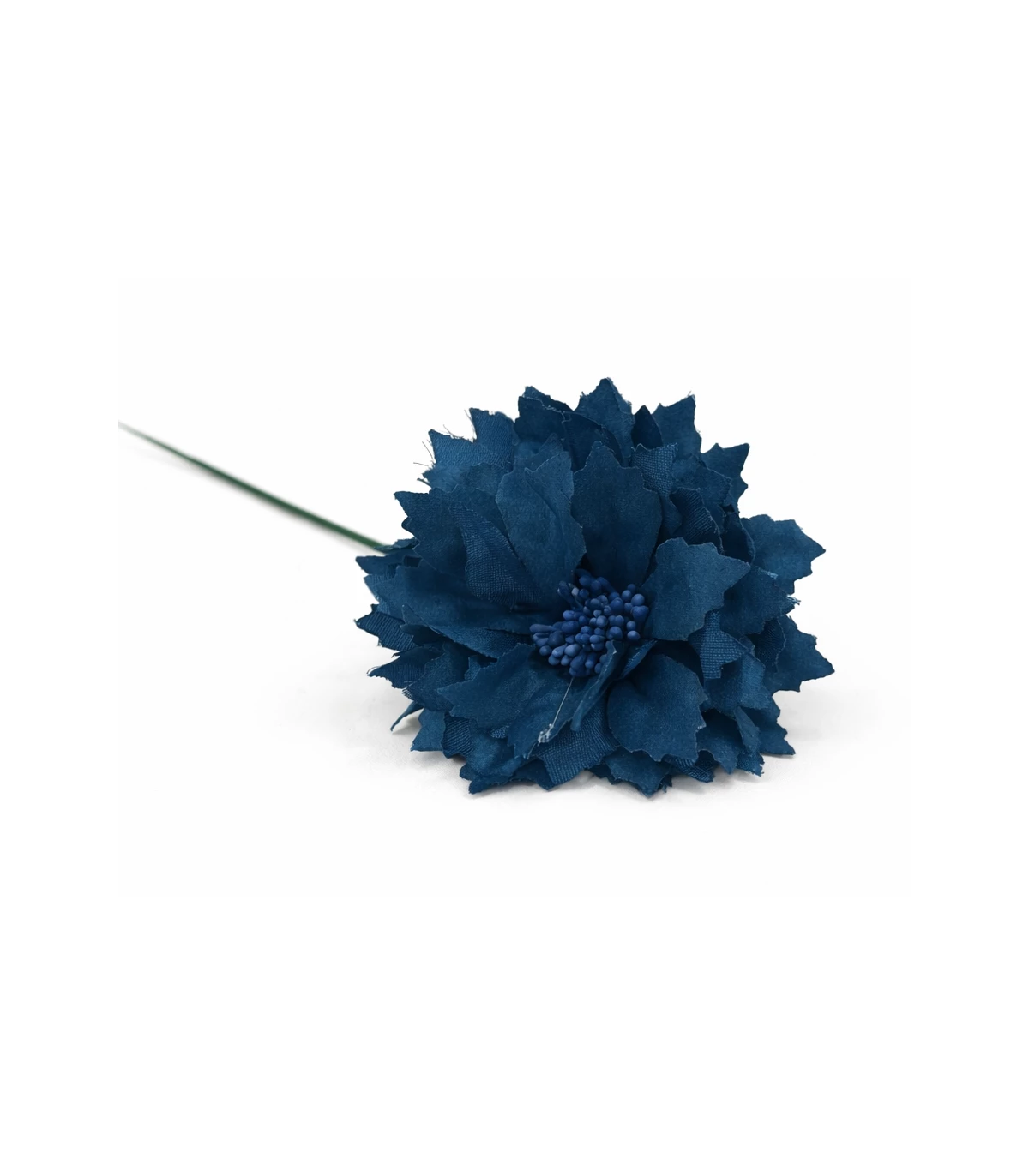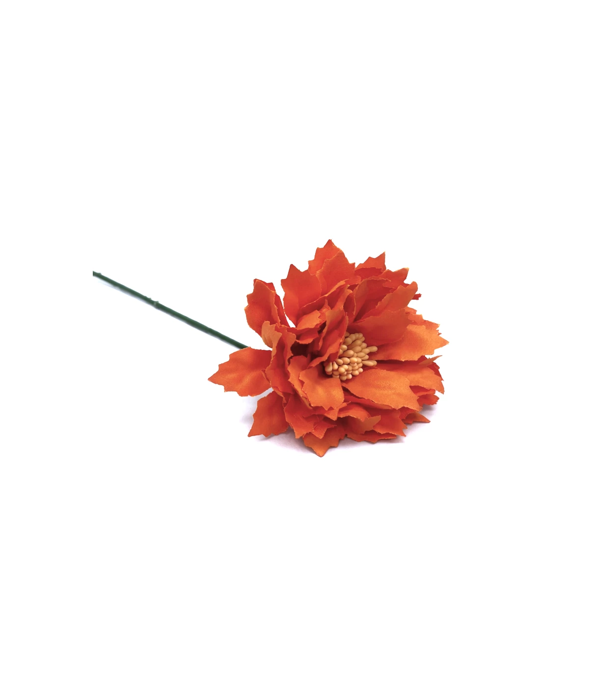 Decorative mini dahlia made from synthetic fabric, featuring inner stamens that add volume and a realistic finish. Its balanced and lightweight design makes it ideal for millinery and creative decoration.