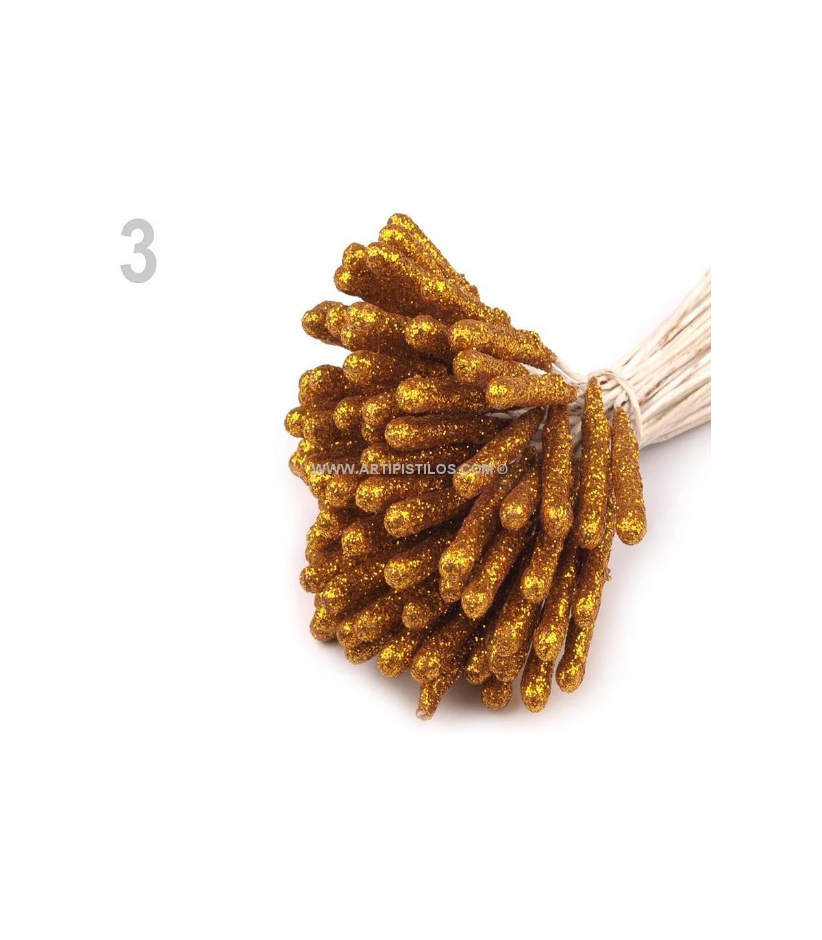 Add a touch of sparkle to your crafts with these elongated glitter stamens. Available in gold and red, each one measures approximately 9 cm long to add an extra touch to your craft projects. Perfect for adding a bit of shine to your designs.