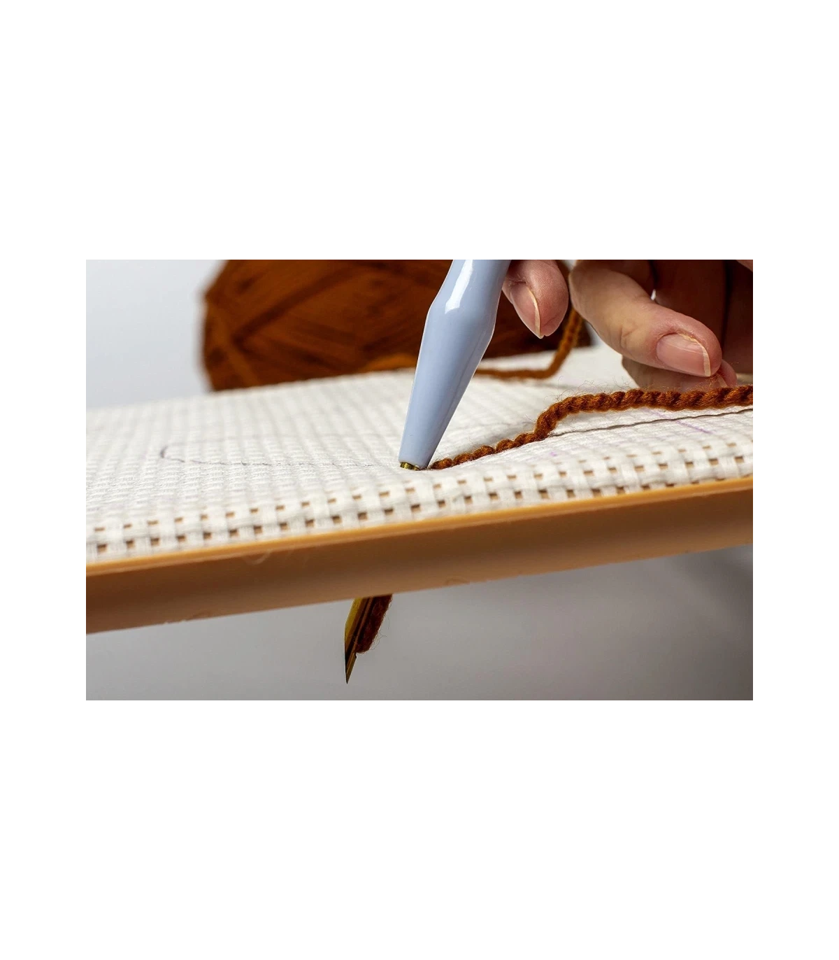 The yarn is threaded using the long threader included in the set. For best results, the pen should be kept perpendicular to the fabric. With each stitch, small loops are formed on the front side of the fabric, creating a raised effect.