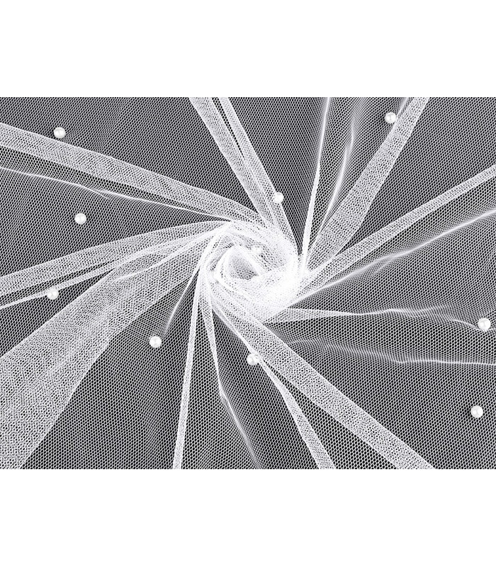 This delicate tulle is adorned with riveted pearls. It's perfect for crafting wedding veils, dresses, skirts, and more.