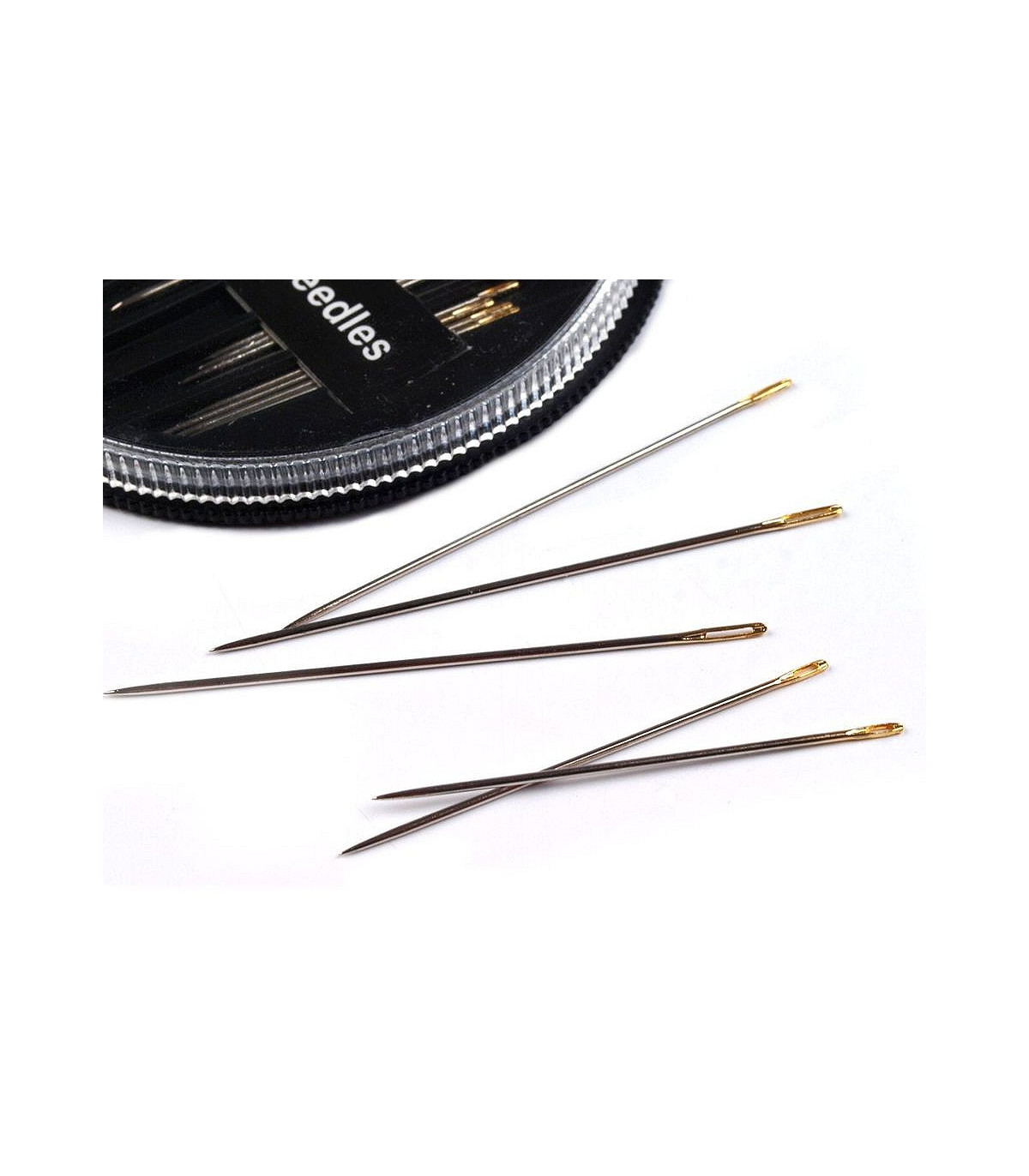 This compact package contains needles of various sizes. A case includes 30 needles, and in the original package, there are 5 cases. The needles feature golden eyelets for easy threading even without a threader.