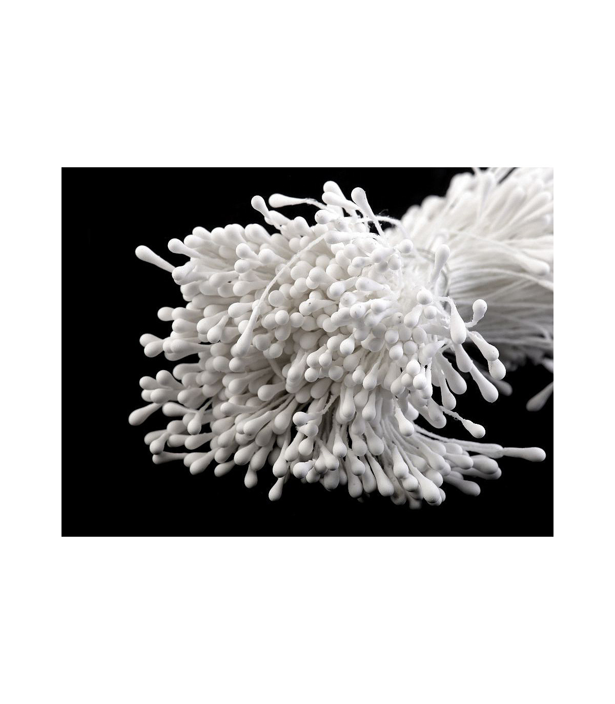 A bunch of artificial flower stamens, suitable for flower making, are matte and attached to a string.