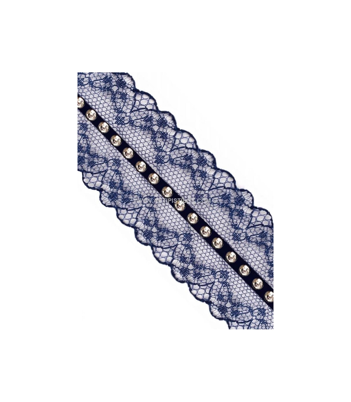 Lace ribbon with rhinestones, available in two colors: blue and black. With a width of 35 mm and a length of 1 m, it is perfect for adding a touch of elegance and shine to your sewing and crafting projects. Ideal for decorating clothing, accessories, and home decor in the rhinestone and bead category.