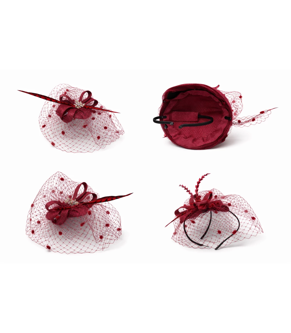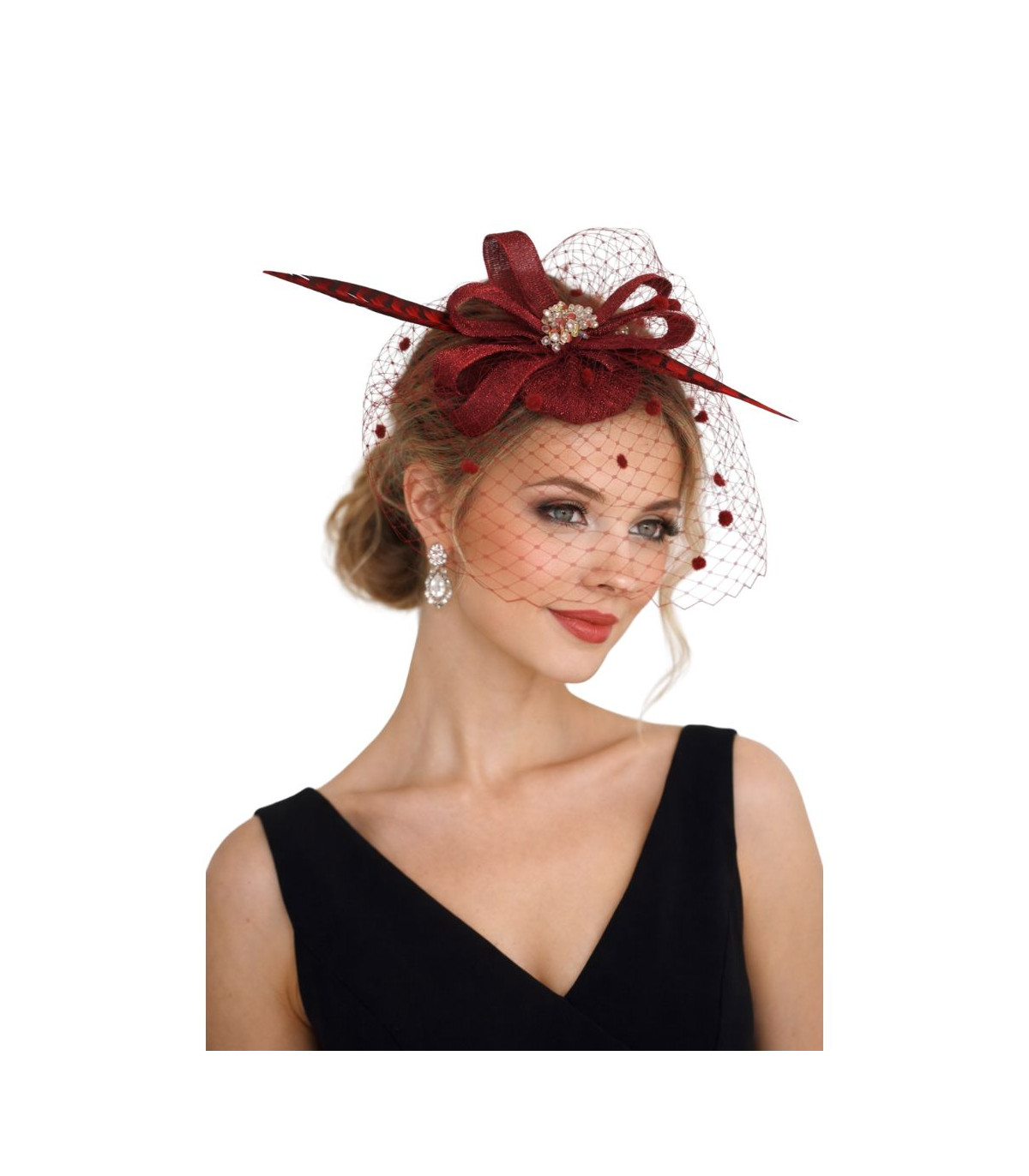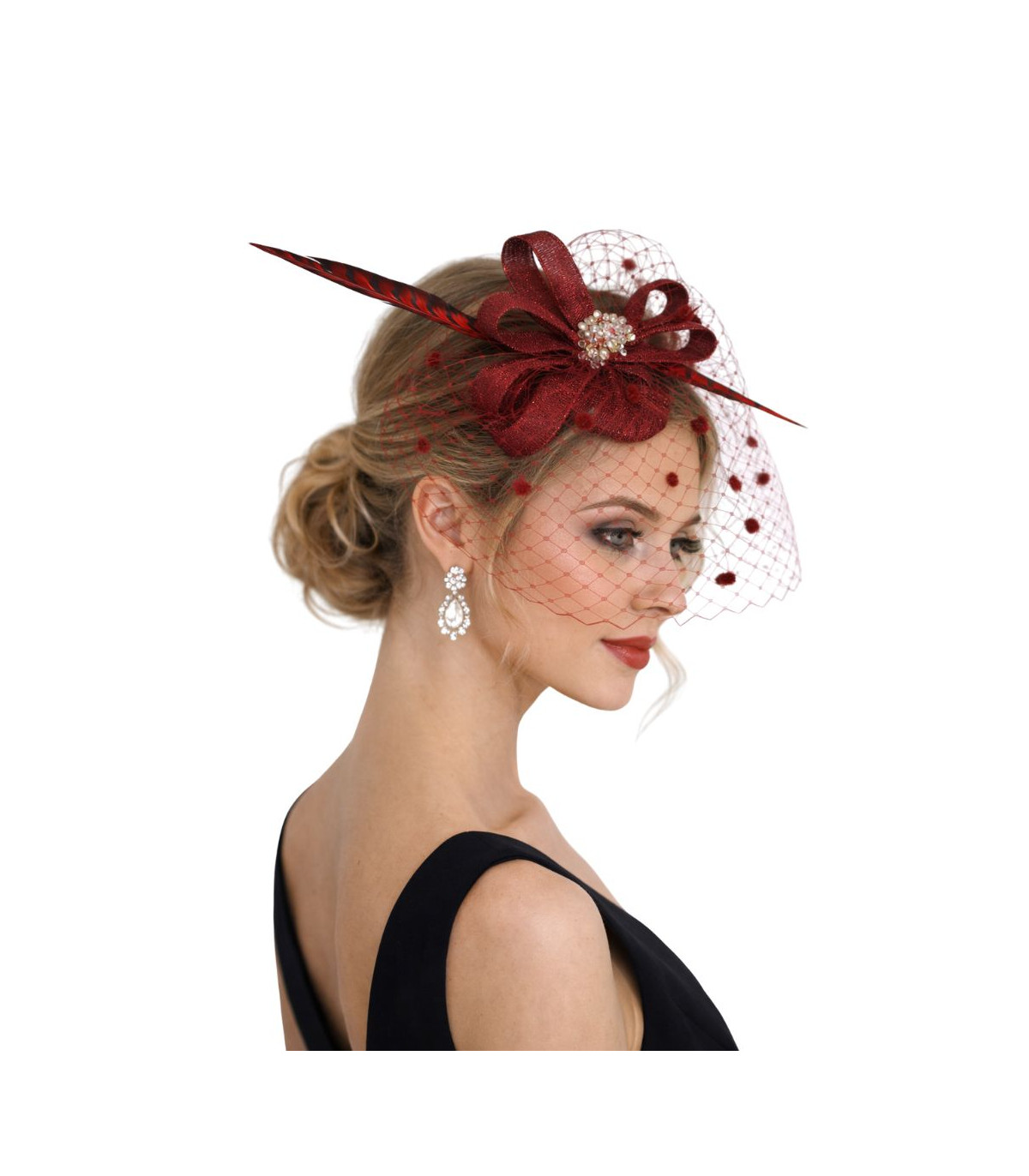 Details: Adorned with a dotted tulle veil and a spectacular pheasant feather.