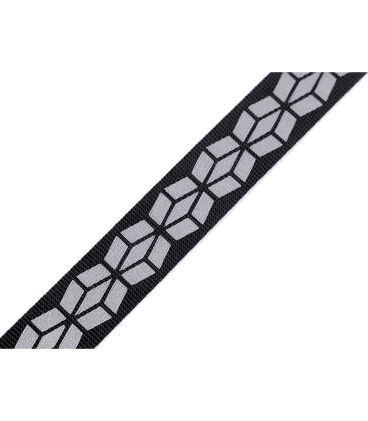 Cinta textil negra de 20 mm de ancho con estampado reflectante de alta visibilidad, perfecta para decorar prendas de vestir, mochilas, accesorios y más. Aporta un toque de estilo y seguridad en condiciones de poca luz. Longitud de 1 metro.