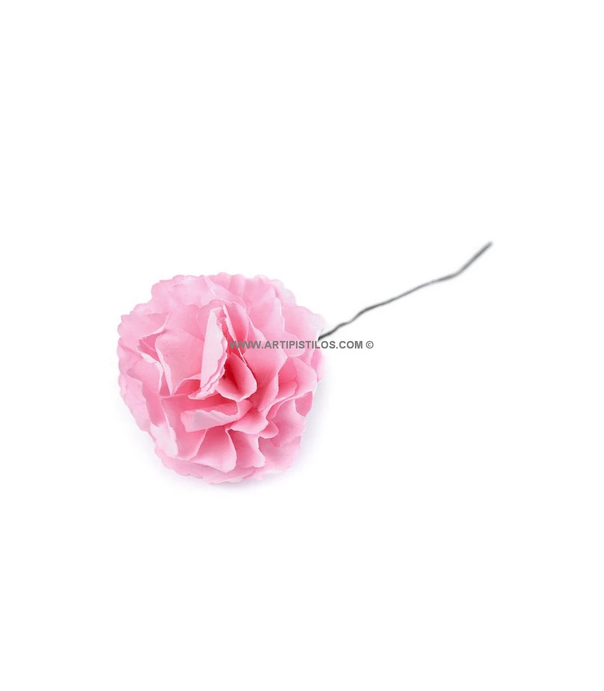 La flor de papel simula a un clavel. Está unida por un cable flexible metálico forrado con cinta floral.