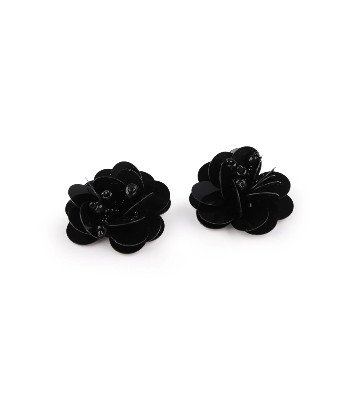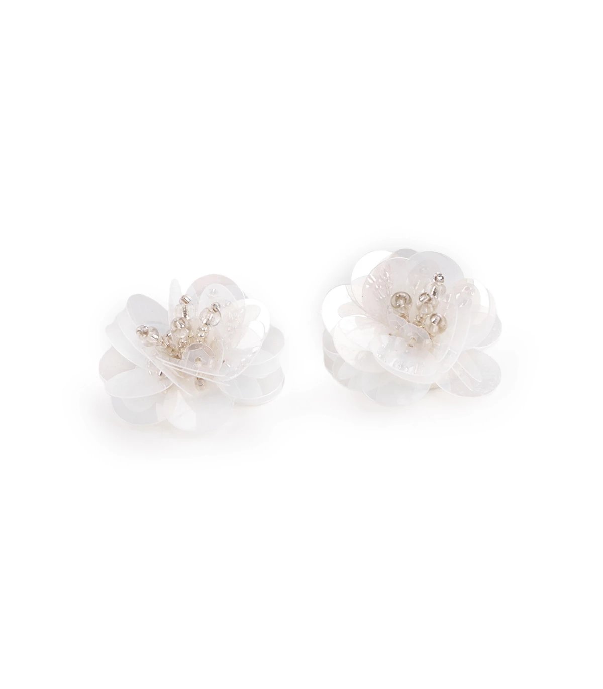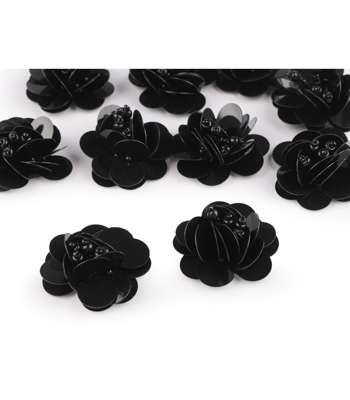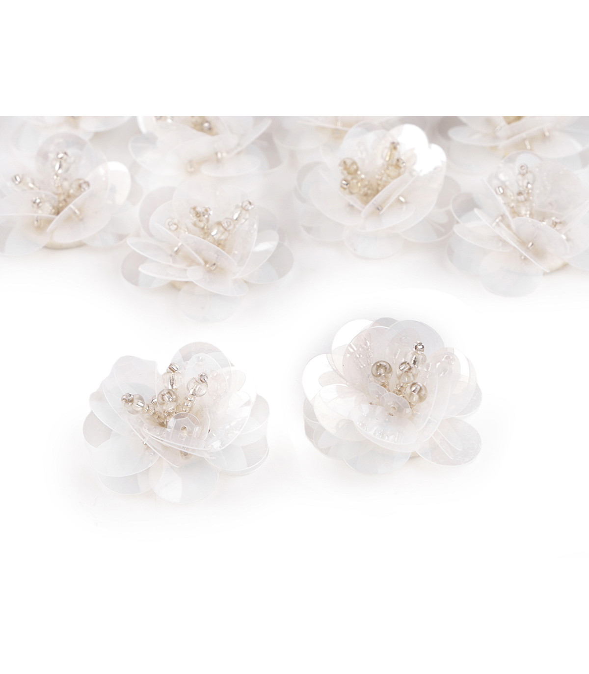 Elegante flor confeccionada con lentejuelas grandes y redondas, con un centro decorado con pistilos de cuentas. Tanto las lentejuelas como los pistilos aportan a la flor un aspecto suntuoso y espectacular.