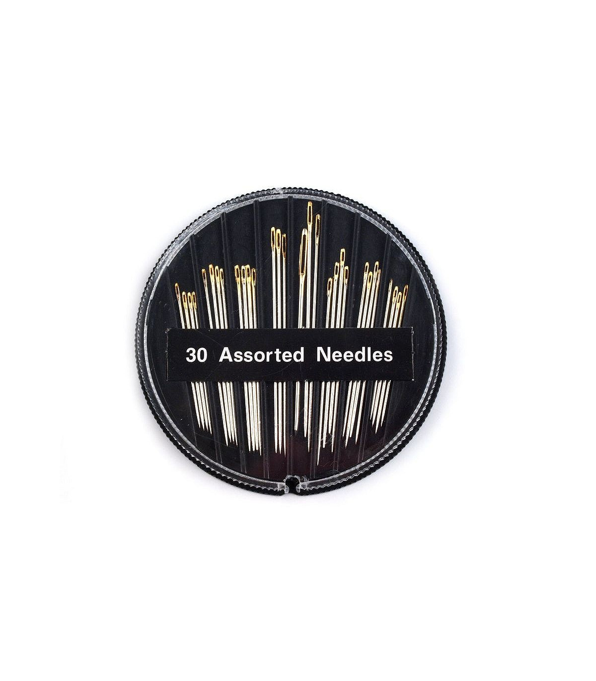 Este conjunto compacto traz agulhas de vários tamanhos. Uma caixa contém 30 agulhas, e na embalagem original existem 5 caixas. As agulhas possuem olhos dourados para facilitar a passagem do fio, mesmo sem um enfiador.