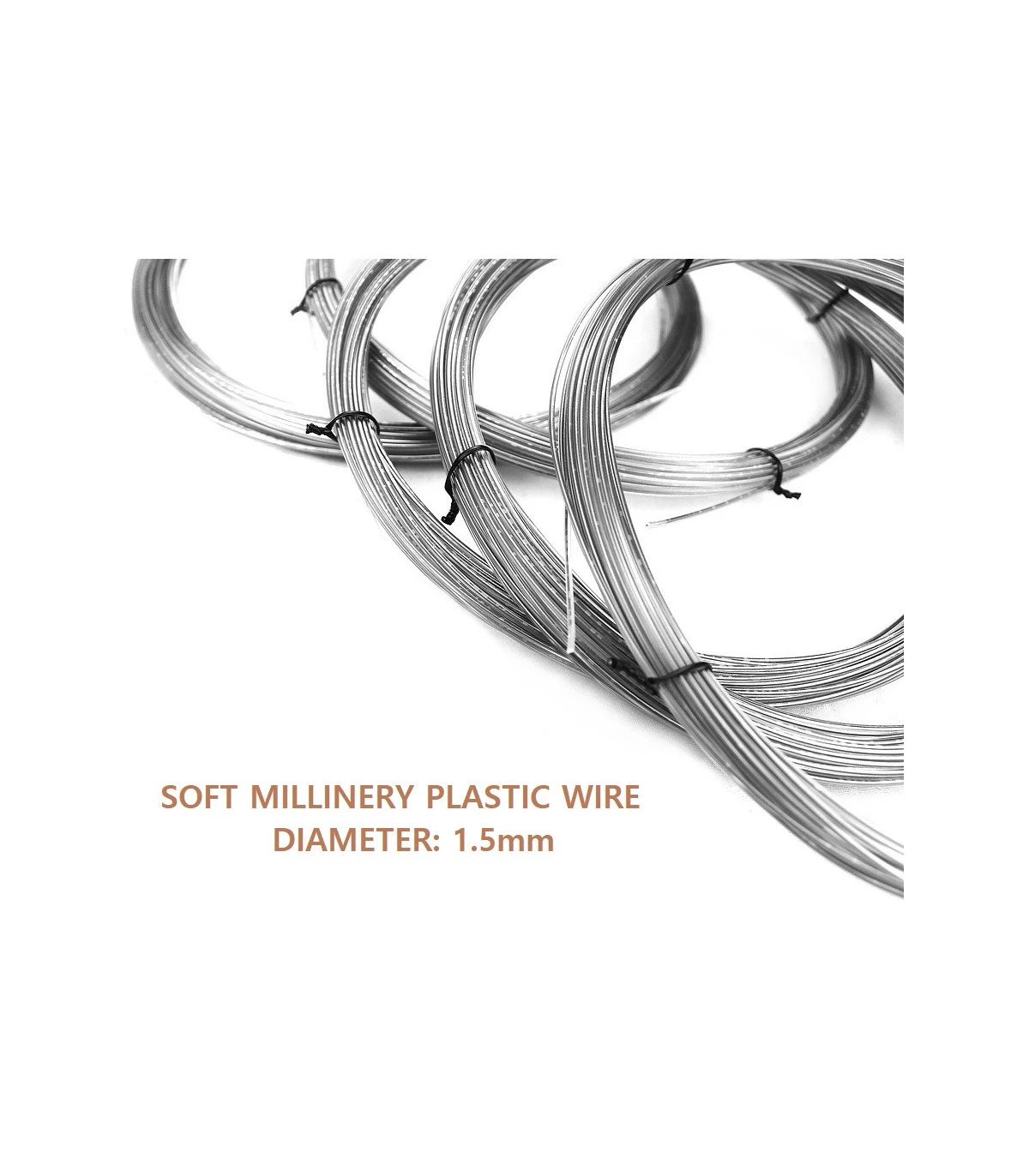 Se trata de alambre galvanizado forrado con plástico blanco o transparente. El resultado es un alambre para sombrerería y textiles ductil, maleable y menos consistente que el alambre clásico de sombrerería, por lo que da solución a muchos de los problemas técnicos que se plantean en el dia a dia de la sombrerería. Este alambre lo puedes utilizar dándole forma ya que tiene "memoria".