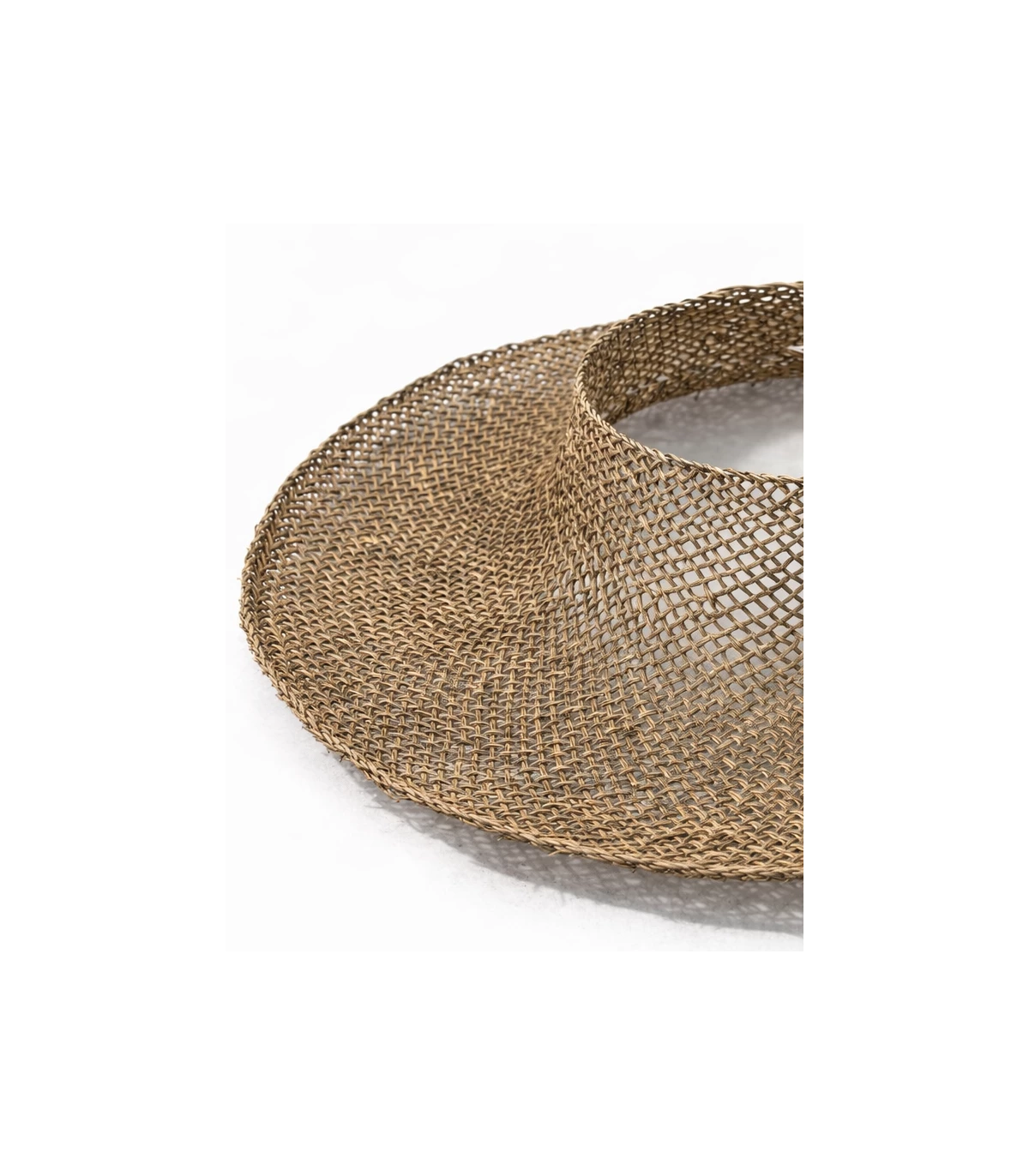 Capelina fabricada em Sea Grass, uma fibra vegetal natural de aspeto quente e textura autêntica, muito apreciada na chapelaria pela sua leveza e respirabilidade. O seu entrançado vazado permite uma excelente ventilação e confere um acabamento natural e artesanal, ideal para criações de verão.